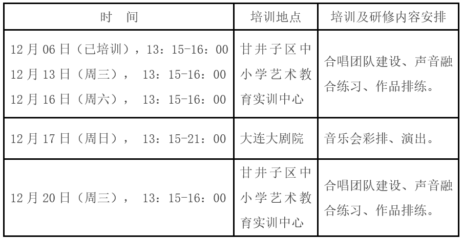 為貫徹落實(shí)中共中央辦公廳、國務(wù)院辦公廳《關(guān)于全面加強(qiáng)和改進(jìn)新時(shí)代學(xué)校美育工作的意見》和中共遼寧省委辦公廳、遼寧省人民政府辦公廳印發(fā)《遼寧省全面加強(qiáng)和改進(jìn)新時(shí)代學(xué)校美育工作若干措施》精神,進(jìn)一步落實(shí)立德樹人的根本任務(wù),提高音樂教師專業(yè)素養(yǎng)和教育教學(xué)能力,提升音樂教育研究和課堂教學(xué)質(zhì)量,提高學(xué)生的審美及人文素養(yǎng),大連市"中小學(xué)藝術(shù)特色項(xiàng)目專項(xiàng)研訓(xùn)"項(xiàng)目組擬于2023年12月繼續(xù)舉辦中小學(xué)音樂教師合唱教學(xué)能力提升培訓(xùn)。