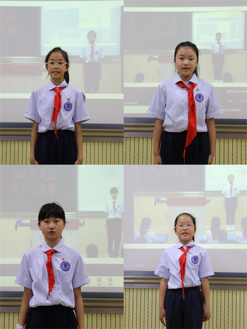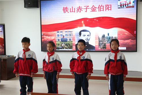 活動(dòng)中,兩校通過“憶英雄、贊英雄、頌英雄、學(xué)英雄”四大環(huán)節(jié),構(gòu)建沉浸式紅色課堂。伯陽小學(xué)以旅順六處金伯陽紀(jì)念地視頻,串聯(lián)起英雄從求學(xué)立志到壯烈犧牲的人生軌跡;凌水小學(xué)學(xué)生生動(dòng)講述金伯陽不同階段的故事,再現(xiàn)其“甘將熱血灑江山”的革命歷程。伯陽小學(xué)學(xué)生朗誦詩歌《鐵山赤子金伯陽》、吟誦金伯陽絕筆詩《述懷》,一句句飽含深情的文字,帶領(lǐng)在場師生跨越時(shí)空,與革命先輩進(jìn)行心靈對(duì)話,在情感共鳴中厚植民族自豪感,賡續(xù)紅色血脈。最后,兩校學(xué)生莊嚴(yán)宣誓,傳承先烈遺志,將愛國情、強(qiáng)國志轉(zhuǎn)化為報(bào)國行。