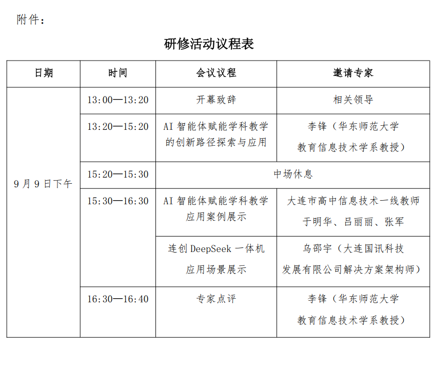 為落實(shí)國(guó)家、遼寧省關(guān)于中小學(xué)人工智能教育的實(shí)施方案要求,按照大連市教育局在2025年全市教育工作會(huì)議上提出的“促進(jìn)人工智能與教育深度融合”的相關(guān)部署,提高教師對(duì)人工智能的理解與應(yīng)用能力,現(xiàn)舉辦“大連市普通高中全學(xué)科教師人工智能素養(yǎng)提升研修活動(dòng)”。有關(guān)事項(xiàng)通知如下: